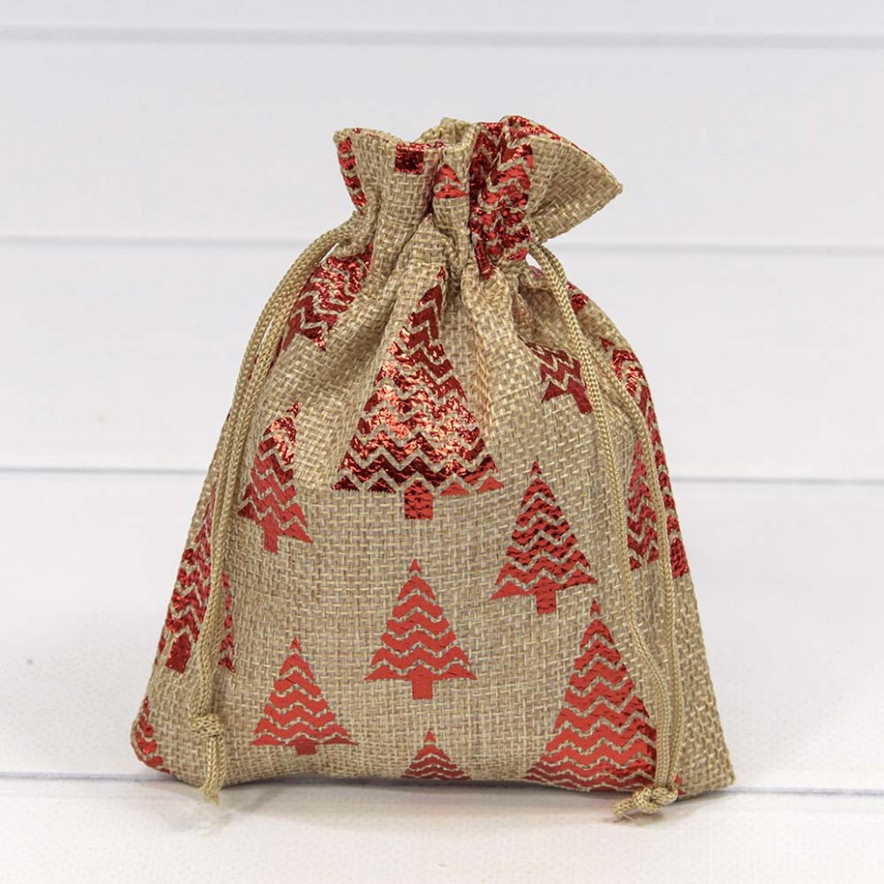 Краткое описание «Мешочки из искусственного льна 12*15 с рисунком Ёлки красный»